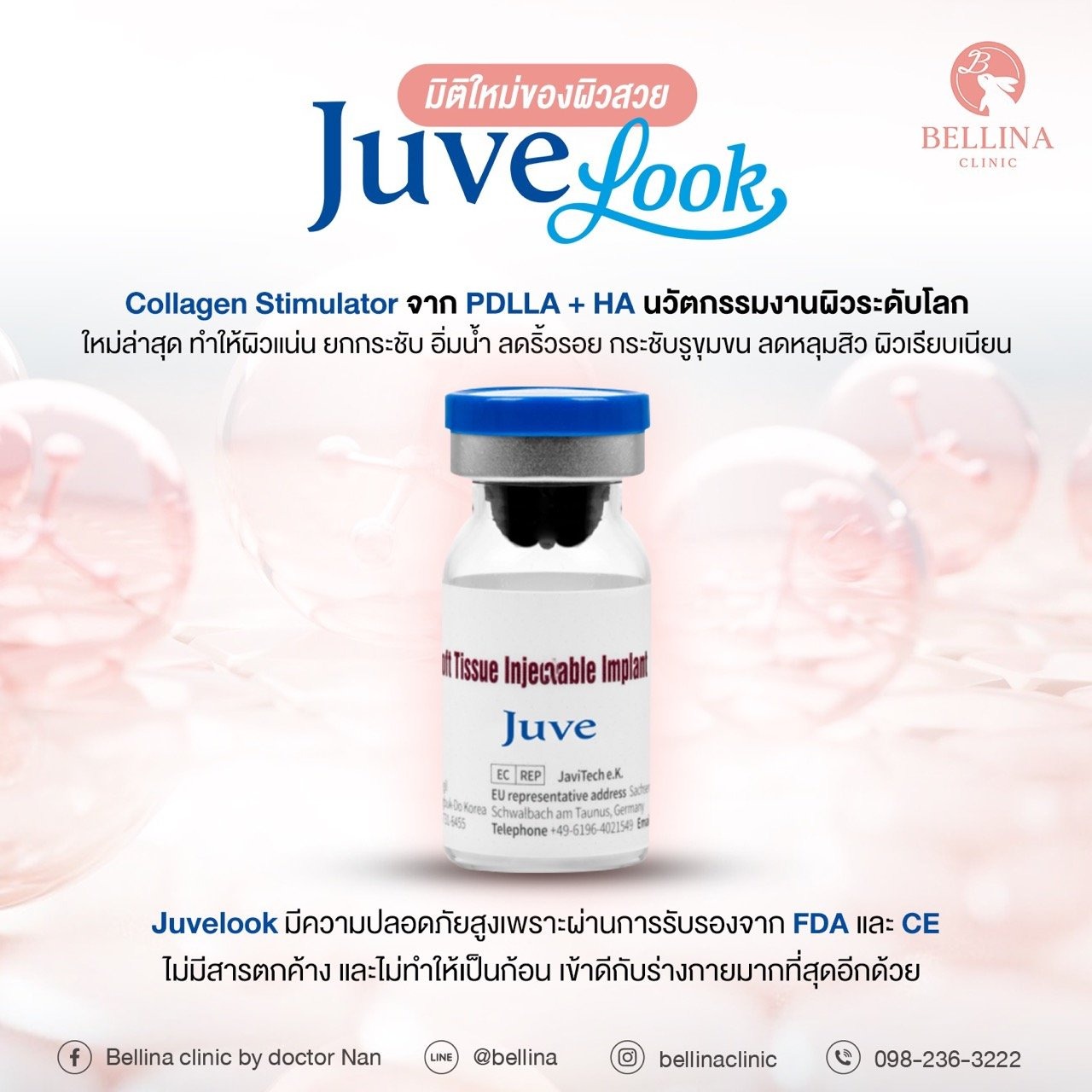 - Juvelook (จูวีลุค) คือ ผลิตภัณฑ์ที่ถูกพัฒนาขึ้นจากคอลลาเจนบูสเตอร์ผ่านการผสานกันอย่างลงตัวระหว่าง 2 อนุภาค ได้แก่ PDLLA และ Noncrosslinked HA ซึ่งมีขนาดอนุภาคระหว่าง 10-40 ไมโครเมตร